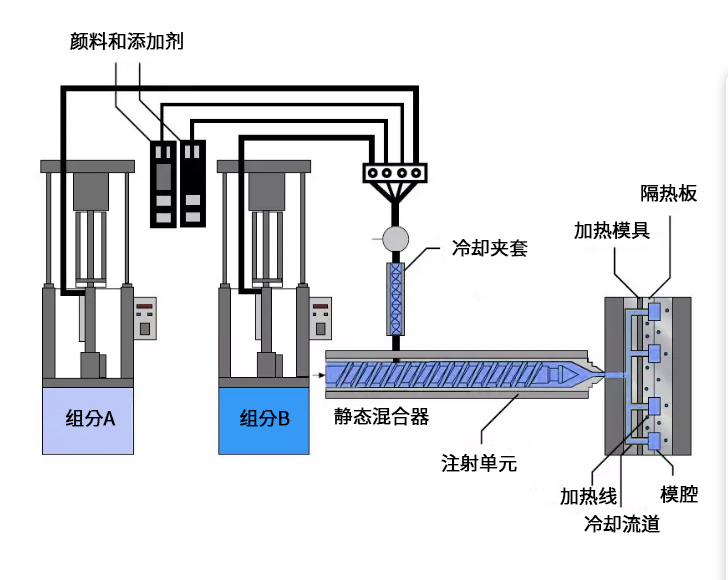 液态硅胶通常由 A 组分(包括硅氧烷聚合物、填料等)和 B 组分(包括交联剂、催化剂等)组成。
